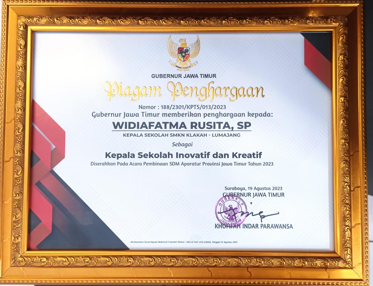 SELAMAT…!, PENGHARGAAN GUBERNUR UNTUK KEPALA SEKOLAH SMKN KLAKAH LUMAJANG.