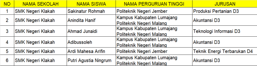 Daftar Siswa SMKN KLAKAH yang Masuk Perguruan Tinggi Negeri 2024 tanpa ” TES ” jalur SNBP