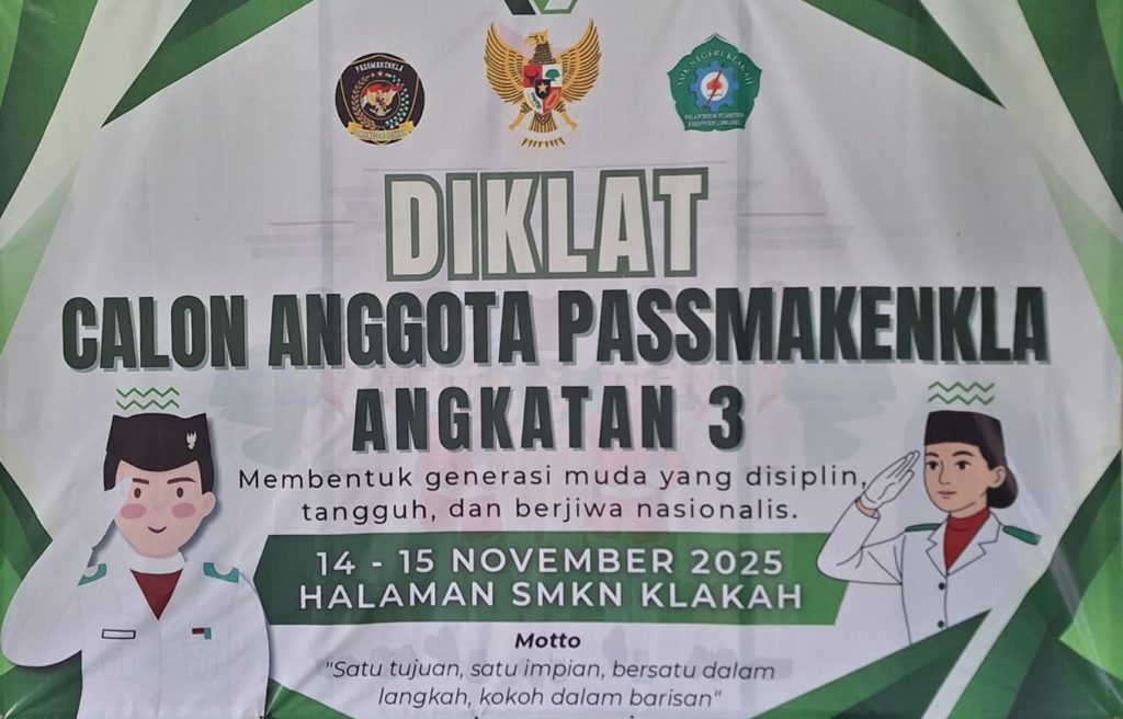 SMKN Klakah, 14–15 November 2025 — Kegiatan Pendidikan dan Pelatihan (Diklat) Calon Anggota PASSMAKENKLA Angkatan 3 resmi digelar selama dua hari penuh dan berlangsung dengan lancar, tertib, serta penuh semangat. Mengusung motto “Satu Tujuan, Satu Impian, Bersatu dalam Langkah, Kokoh dalam Barisan”, kegiatan ini menjadi momentum penting dalam membentuk calon anggota paskibra yang tangguh, disiplin, dan berkarakter.